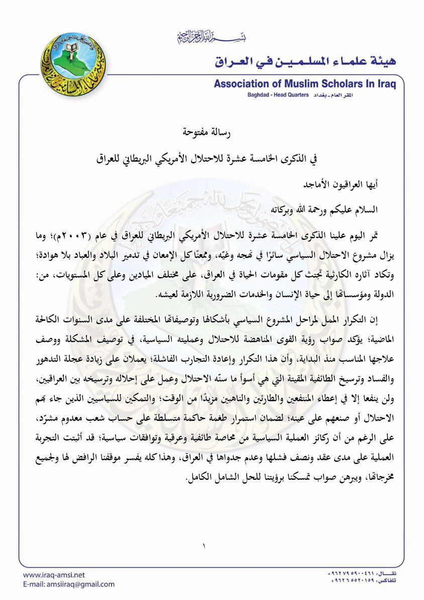 • رسالة مفتوحة إلى الشعب العراقي في الذكرى السادسة عشرة لاحتلال العراق