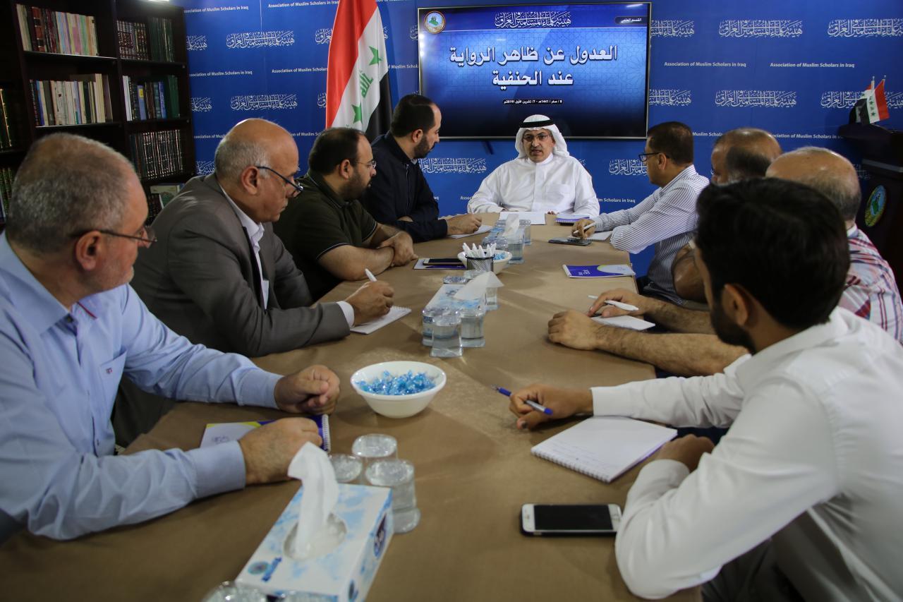 الهيئة نت ـ عمّان| نظّم القسم العلمي في هيئة علماء المسلمين في العراق؛ محاضرة بعنوان (العدول عن ظاهر الرواية عند الحنفية) قدّمها الأستاذ (حاتم حميدي الضاري) الذي ناقش وعدد من طلبة العلم في الهيئة قضايا ومسائل متعددة في هذا المجال.