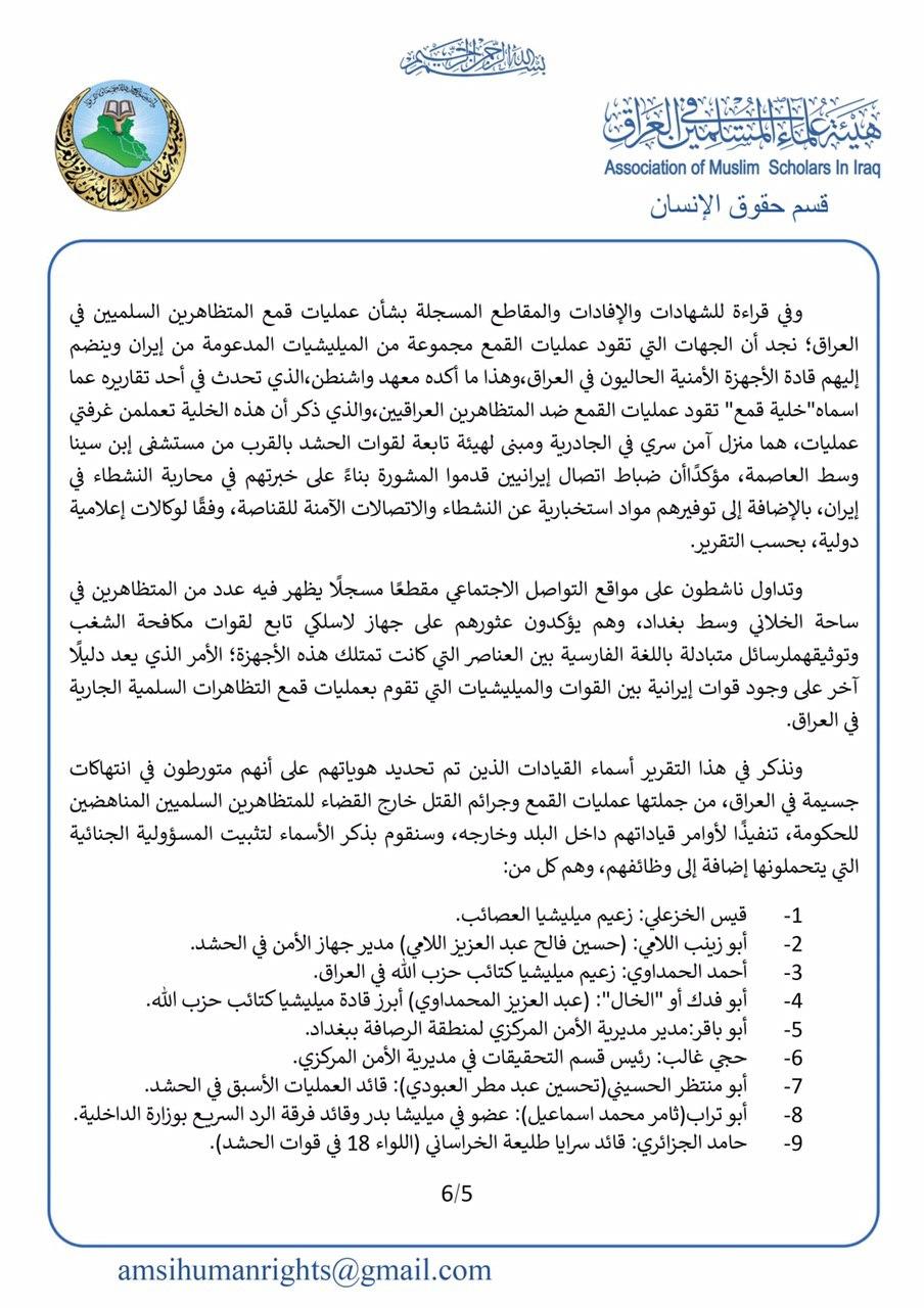ونذكر في هذا التقرير أسماء القيادات الذين تم تحديد هوياتهم على أنهم متورطون في انتهاكات جسيمة في العراق، من جملتها عمليات القمع وجرائم القتل خارج القضاء للمتظاهرين السلميين المناهضين للحكومة، تنفيذًا لأوامر قياداتهم داخل البلد وخارجه، وسنقوم بذكر الأسماء لتثبيت المسؤولية الجنائية التي يتحملونها إضافة إلى وظائفهم، وهم كل من: