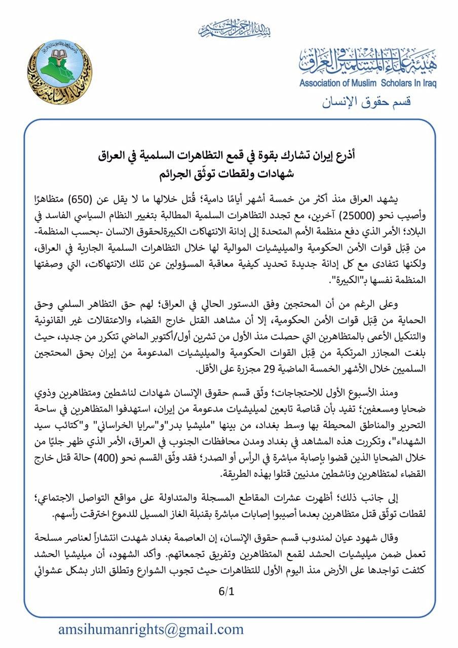 وعلى الرغم من أن المحتجين وفق الدستور الحالي في العراق؛ لهم حق التظاهر السلمي وحق الحماية من قِبَل قوات الأمن الحكومية، إلا أن مشاهد القتل خارج القضاء والاعتقالات غير القانونية والتنكيل الأعمى بالمتظاهرين التي حصلت منذ الأول من تشرين أول/أكتوبر الماضي تتكرر من جديد، حيث بلغت المجازر المرتكبة من قِبَل القوات الحكومية والميليشيات المدعومة من إيران بحق المحتجين السلميين خلال الأشهر الخمسة الماضية 29 مجزرة على الأقل.