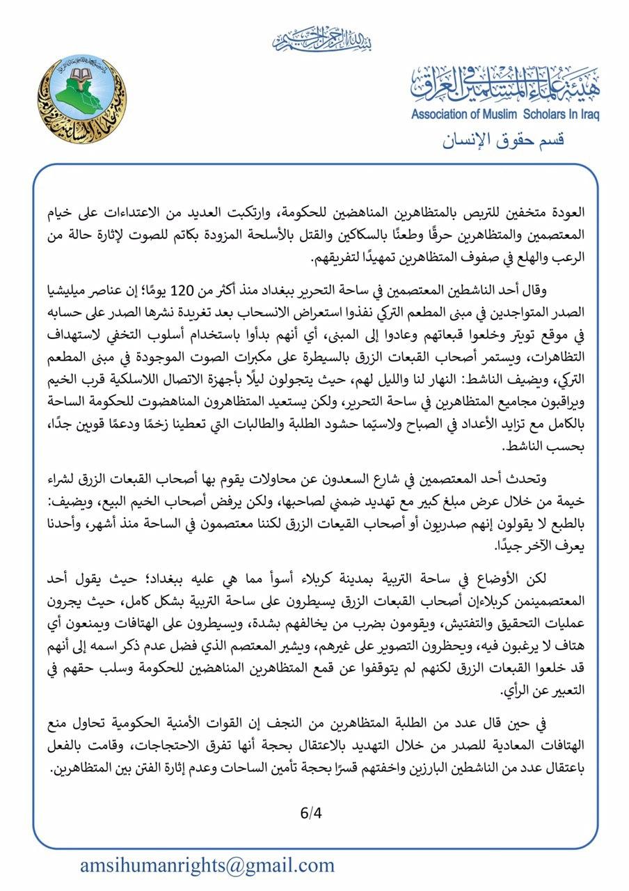 وقال شهود عيان لمندوب قسم حقوق الإنسان، إن العاصمة بغداد شهدت انتشاراً لعناصر مسلحة تعمل ضمن ميليشيات الحشد لقمع المتظاهرين وتفريق تجمعاتهم. وأكد الشهود، أن ميليشيا الحشد كثفت تواجدها على الأرض منذ اليوم الأول للتظاهرات حيث تجوب الشوارع وتطلق النار بشكل عشوائي من أسلحة خفيفة ومتوسطة وثقيلة لقمع التظاهرات وتفريقها، في حين تقوم القوات الأمنية الحكومية بإخبار المتظاهرين حينما يتعرضون للقمع بأن "هذه القوات غير تابعة لها وأنهم لا يستطيعون فعل شيء لردعها"، بحسب الشهود.