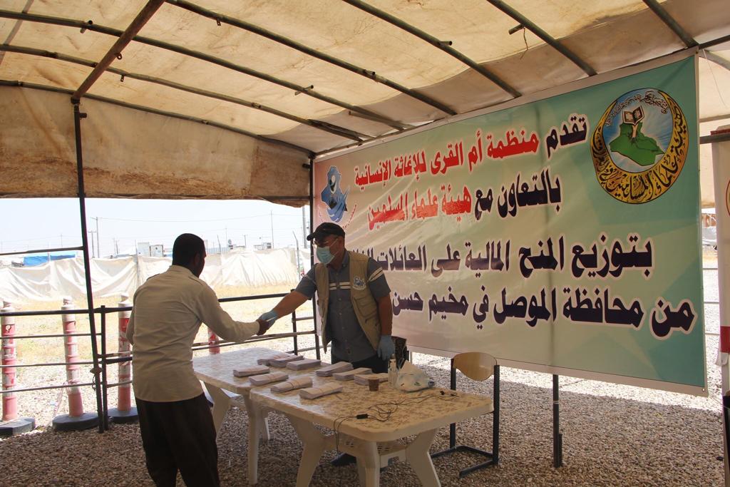 الهيئة نت| قام القسم الإغاثي في هيئة علماء المسلمين بالتعاون مع منظمة (أم القرى) للإغاثة الإنسانية؛ بحملتهما الثانية لتوزيع المنح المالية على العائلات النازحة في مخيم (حسن شام) الثالث - U3 شرق مدينة الموصل في محافظة نينوى شمالي العراق.