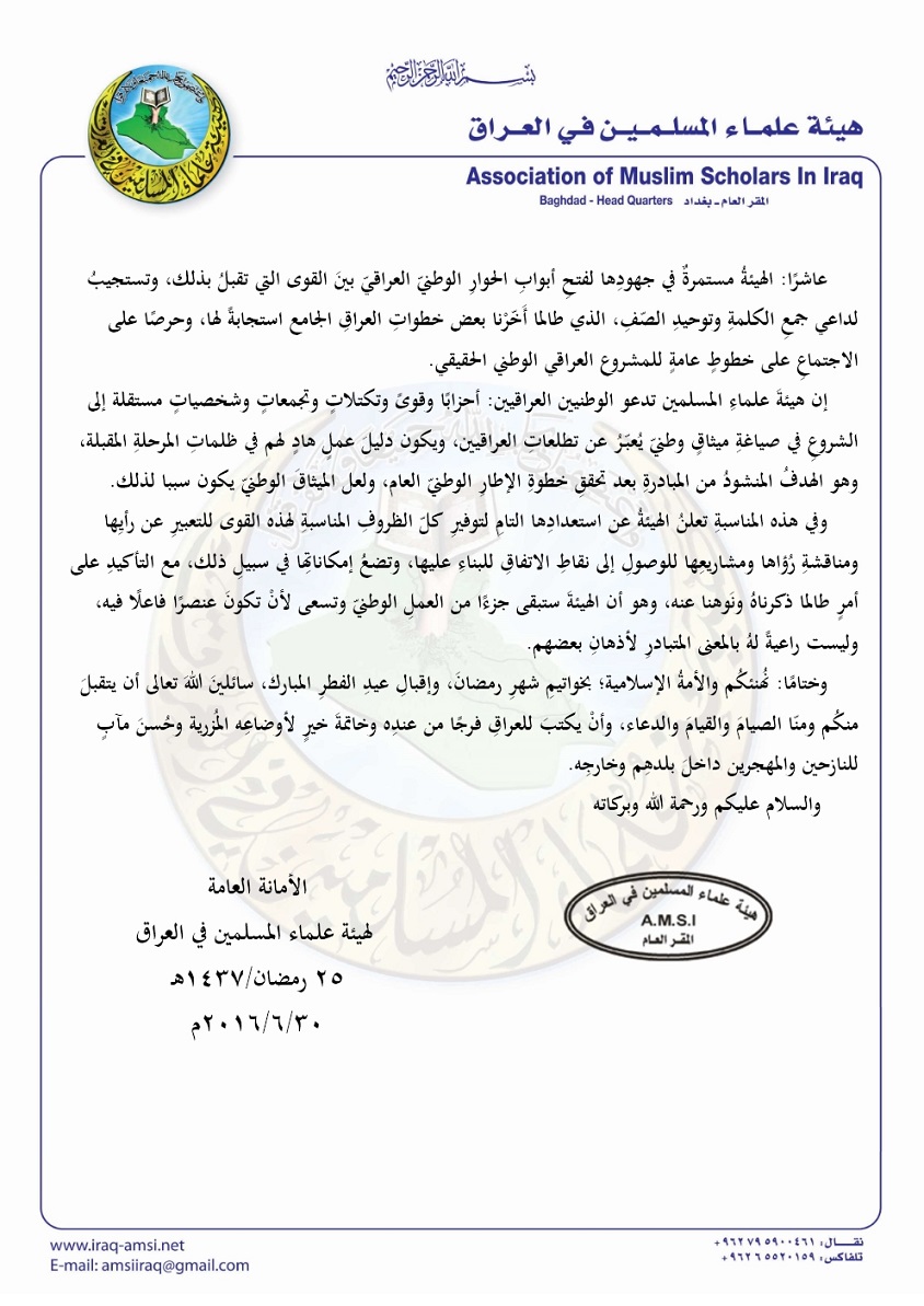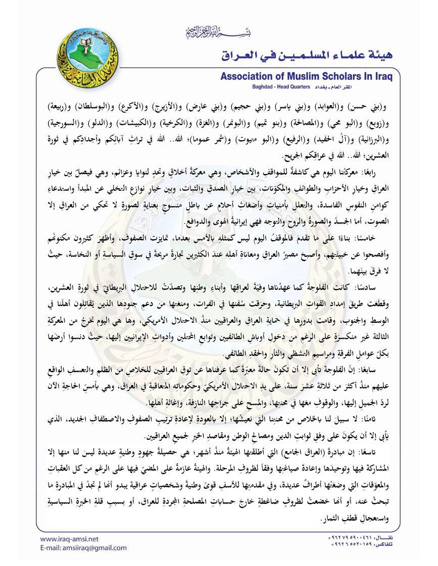 عاشرًا: الهيئةُ مستمرةٌ في جهودِها لفتحِ أبوابِ الحوارِ الوطنيّ العراقيّ بينَ القوى التي تقبلُ بذلك، وتستجيبُ لداعي جمعِ الكلمةِ وتوحيدِ الصّفِ، الذي طالما أَخّرْنا بعض خطواتِ العراقِ الجامع استجابةً لها، وحرصًا على الاجتماعِ على خطوطٍ عامةٍ للمشروع العراقي الوطني الحقيقي.