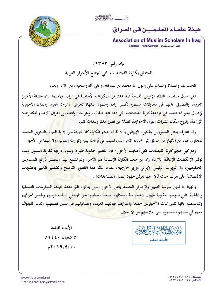 بيان (1373) المتعلق بكارثة الفيضانات التي تجتاح الأحواز العربية .. أكمل القراءة »