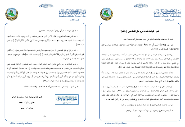 فتوى شرعية بشأن تحريم قتل المتظاهرين في العراق