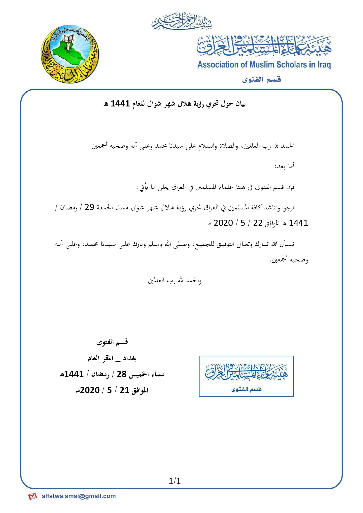 بيان بشأن عيد الفطر المبارك للعام 1440هـ الحمد لله رب العالمين والصلاة والسلام على نبينا محمد بن عبد الله، وعلى آله وصحبه أجمعين. أما بعد: يعلن قسم الفتوى في هيئة علماء المسلمين للإخوة المسلمين في العراق ما يأتي: 1. ثبت شرعًا أن يوم غدٍ الثلاثاء هو يوم عيد الفطر .. أكمل القراءة »