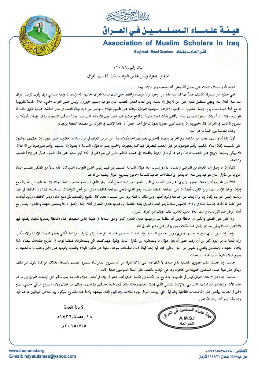 بيان رقم (1086)المتعلق بدعوة رئيس مجلس النواب الحالي لتقسيم العراق الحمد لله والصلاة والسلام على رسول الله وعلى آله وصحبه ومن والاه، وبعد: ففي خطوة غير مسبوقة تكشف جلياً عما كنا ننبه عليه من وجود نوايا مريضة، ومخطط خفي لدى ساسة العراق الحاليين، له ارتباطات وثيقة .. أكمل القراءة »