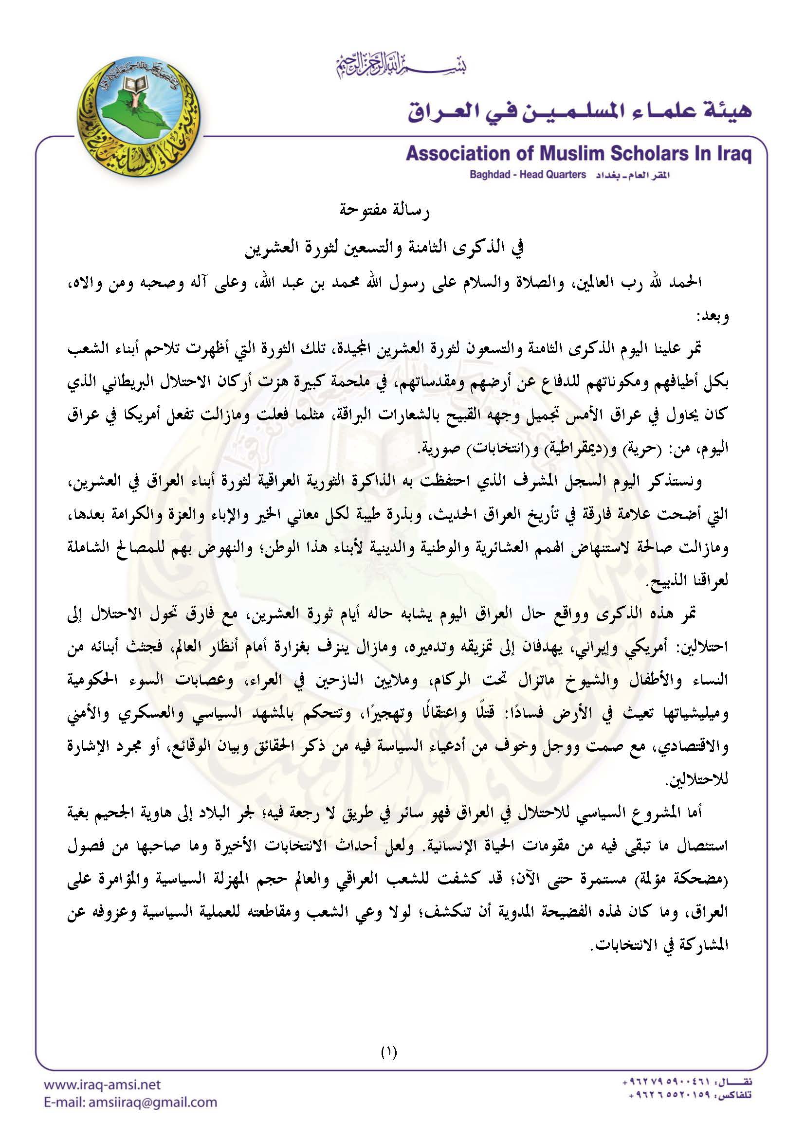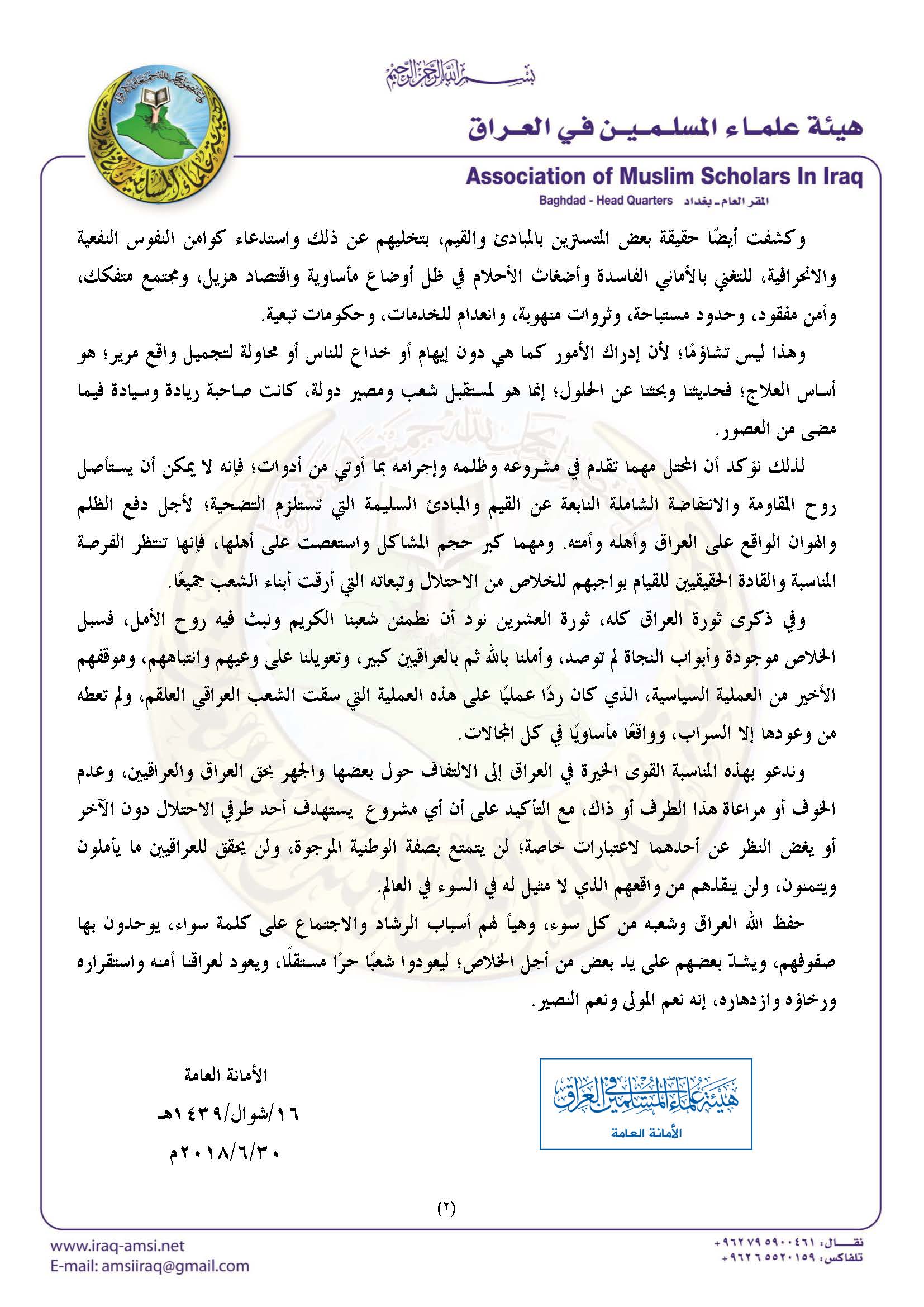 وفي ذكرى ثورة العراق كله، ثورة العشرين نود أن نطمئن شعبنا الكريم ونبث فيه روح الأمل، فسبل الخلاص موجودة وأبواب النجاة لم توصد، وأملنا بالله ثم بالعراقيين كبير، وتعويلنا على وعيهم وانتباههم، وموقفهم الأخير من العملية السياسية، الذي كان ردًا عمليًا على هذه العملية التي سقت الشعب العراقي العلقم، ولم تعطه من وعودها إلا السراب، وواقعًا مأساويًا في كل المجالات.