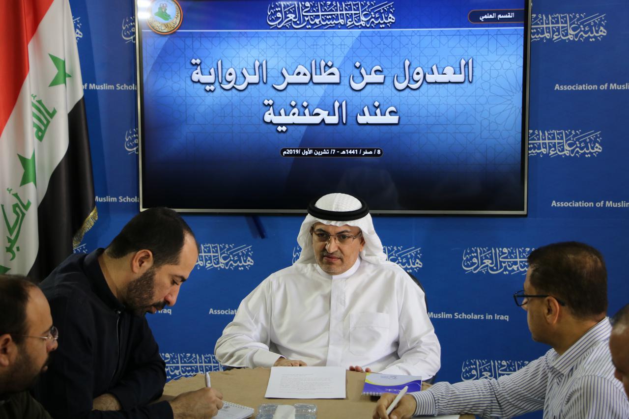 الهيئة نت ـ عمّان| نظّم القسم العلمي في هيئة علماء المسلمين في العراق؛ محاضرة بعنوان (العدول عن ظاهر الرواية عند الحنفية) قدّمها الأستاذ (حاتم حميدي الضاري) الذي ناقش وعدد من طلبة العلم في الهيئة قضايا ومسائل متعددة في هذا المجال.