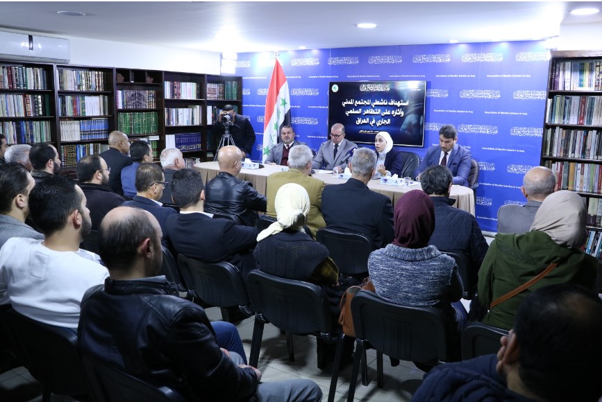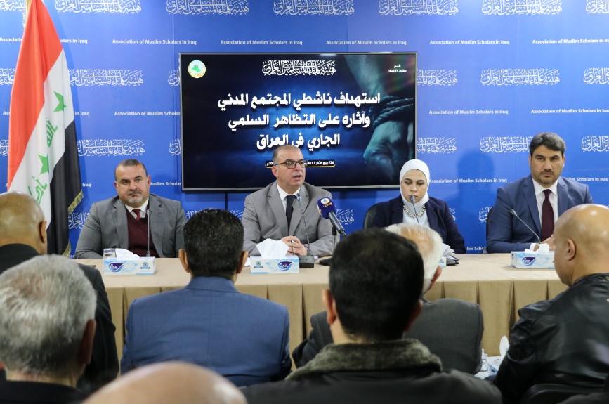 الهيئة نت ـ عمّان| نظّم قسم حقوق الإنسان في هيئة علماء المسلمين؛ ندوة بحثية بعنوان: (استهداف ناشطي المجتمع المدني وآثاره على التظاهر السلمي الجاري في العراق) بحضور ومشاركة عدد من المحامين والباحثين والناشطين في ميدان حقوق الإنسان، فضلاً عن العاملين في عدد من أقسام الهيئة ذات الصلة بالعمل الإنساني والرصد الإعلامي.