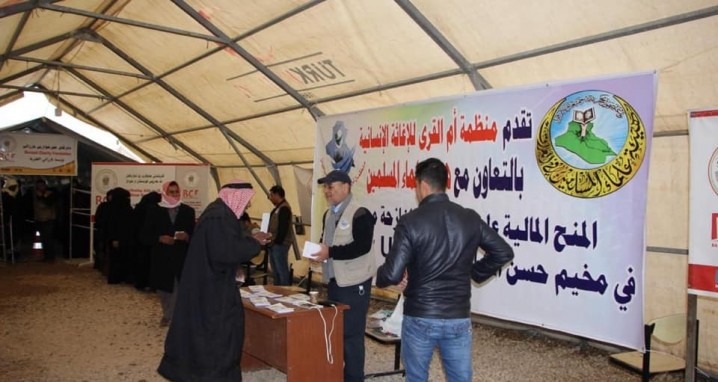 الهيئة نت| وزّع القسم الإغاثي في هيئة علماء المسلمين في العراق، بالتعاون مع منظمة أم القرى للإغاثة الإنسانية، منحًا مالية على العائلات النازحة في مخيم (حسن شام) الثاني U2 شرقي الموصل في محافظة نينوى.