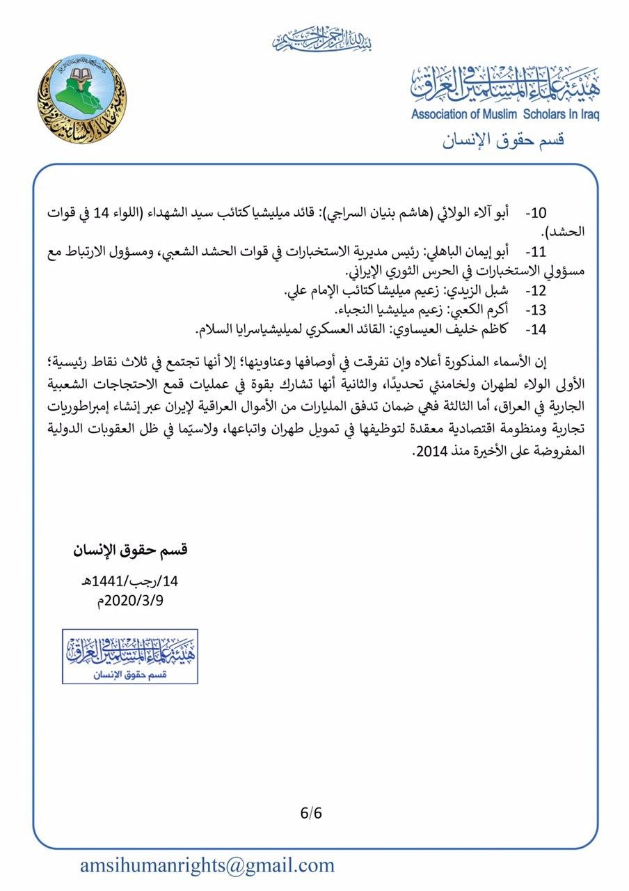 ونذكر في هذا التقرير أسماء القيادات الذين تم تحديد هوياتهم على أنهم متورطون في انتهاكات جسيمة في العراق، من جملتها عمليات القمع وجرائم القتل خارج القضاء للمتظاهرين السلميين المناهضين للحكومة، تنفيذًا لأوامر قياداتهم داخل البلد وخارجه، وسنقوم بذكر الأسماء لتثبيت المسؤولية الجنائية التي يتحملونها إضافة إلى وظائفهم، وهم كل من: