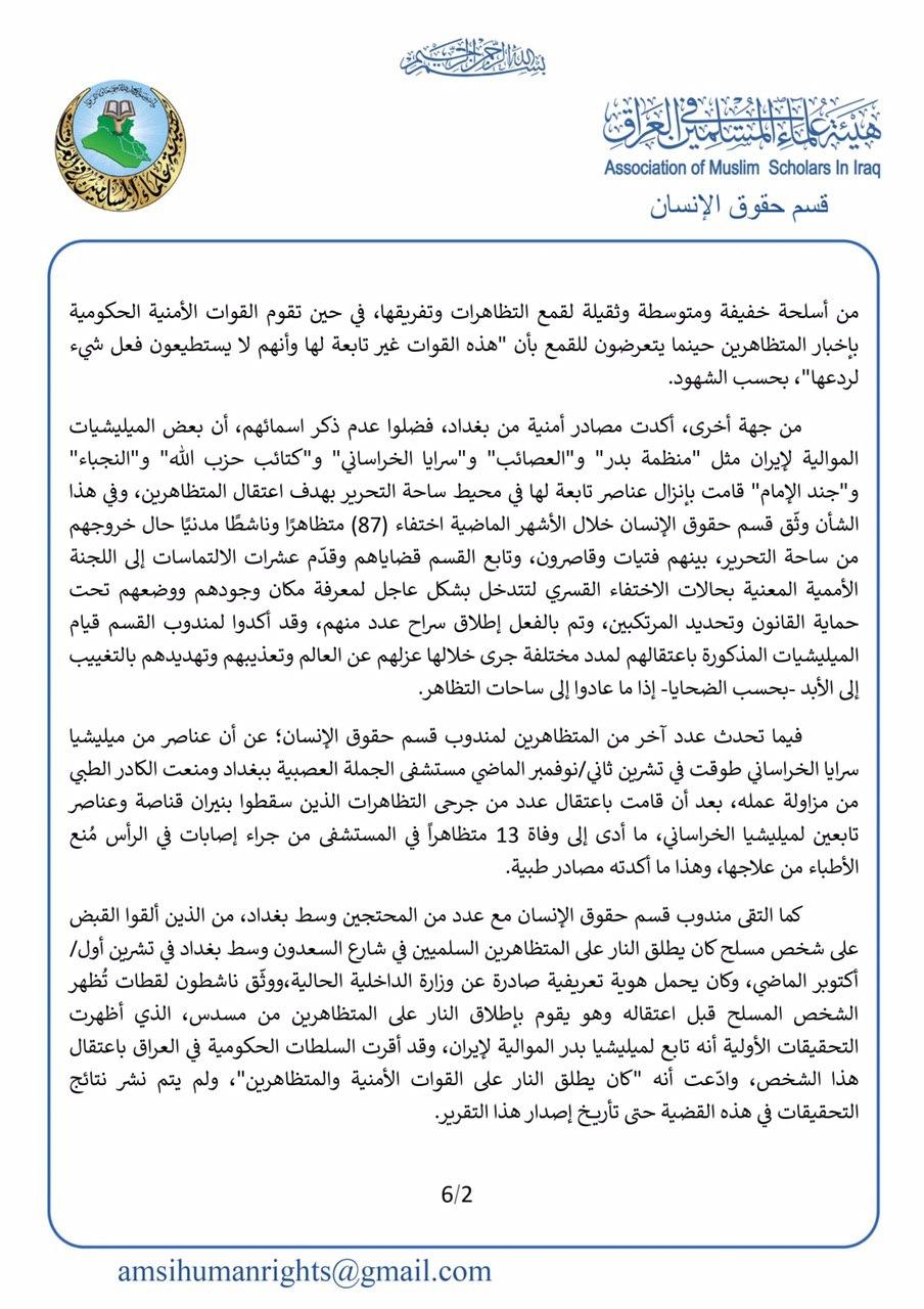 وعلى الرغم من أن المحتجين وفق الدستور الحالي في العراق؛ لهم حق التظاهر السلمي وحق الحماية من قِبَل قوات الأمن الحكومية، إلا أن مشاهد القتل خارج القضاء والاعتقالات غير القانونية والتنكيل الأعمى بالمتظاهرين التي حصلت منذ الأول من تشرين أول/أكتوبر الماضي تتكرر من جديد، حيث بلغت المجازر المرتكبة من قِبَل القوات الحكومية والميليشيات المدعومة من إيران بحق المحتجين السلميين خلال الأشهر الخمسة الماضية 29 مجزرة على الأقل.
