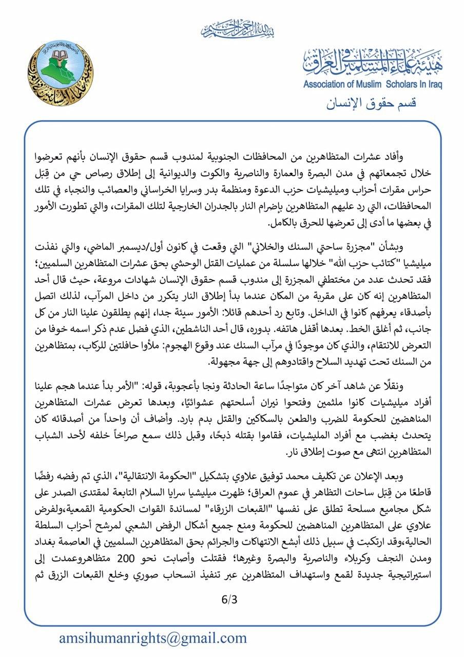 وبشأن "مجزرة ساحتي السنك والخلاني" التي وقعت في كانون أول/ديسمبر الماضي، والتي كشفت القرائن والأدلة عن أن ميليشيا "كتائب حزب الله" نفذت خلالها سلسلة من عمليات القتل الوحشي بحق عشرات المتظاهرين السلميين؛ فقد تحدث عدد من مختطفي المجزرة إلى مندوب قسم حقوق الإنسان شهادات مروعة، حيث قال أحدهم إنه كان على مقربة من المكان عندما بدأ إطلاق النار يتكرر من داخل المرآب، لذلك اتصل بأصدقاء يعرفهم كانوا في الداخل. وتابع رد أحد المتظاهرينقائلا: الأمور سيئة جدا، إنهم يطلقون علينا النار من كل جانب، ثم أغلق الخط. بعدها أقفل هاتفه. بدوره،قال أحد الناشطين، الذي فضل عدم ذكر اسمه خوفا من التعرض للانتقام، والذي كان موجودًا في مرآب السنك عند وقوع الهجوم: ملأوا حافلتين للركاب، بمتظاهرين من السنك تحت تهديد السلاح واقتادوهم إلى جهة مجهولة.