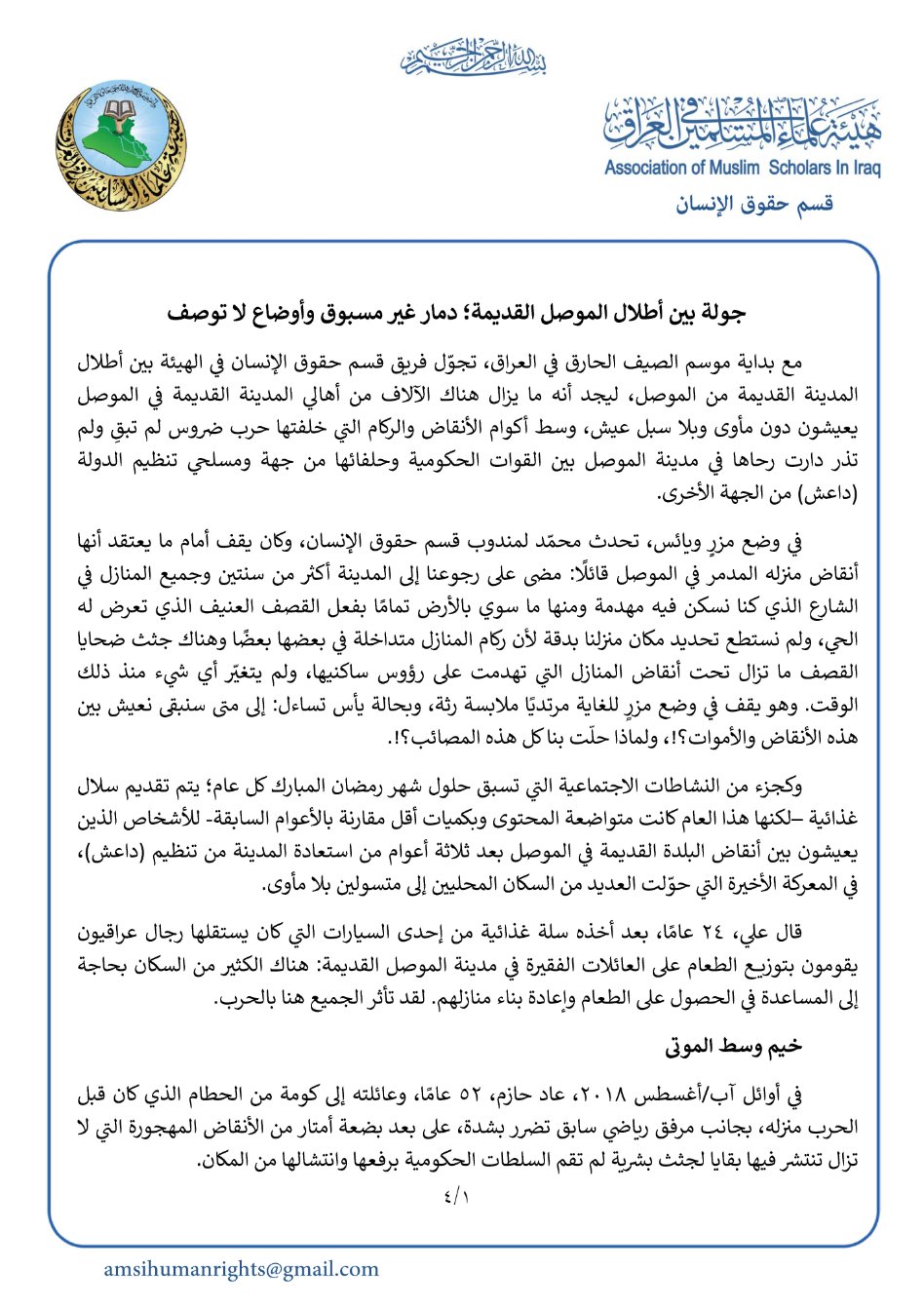 أصدر قسم حقوق الإنسان في هيئة علماء المسلمين في العراق تقريرًا بعنوان: جولة بين أطلال الموصل القديمة؛ دمار غير مسبوق وأوضاع لا توصف، وفيما يلي نص التقرير:
