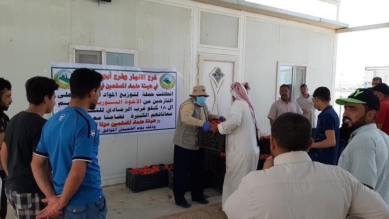 وتم توزيع المواد غذائية من الخضروات في المخيم الذي تعيش فيه العائلات أوضاع صعبة لانقطاع المساعدات عنهم وعدم الالتفات إليهم من أي جهة، والمخيم موجود في صحراء المحافظة وبعيد عن الطرق والمواصلات مما جعل القاطنين فيه من إخوتنا السوريين بحاجة لجميع المساعدات الإنسانية الضرورية.