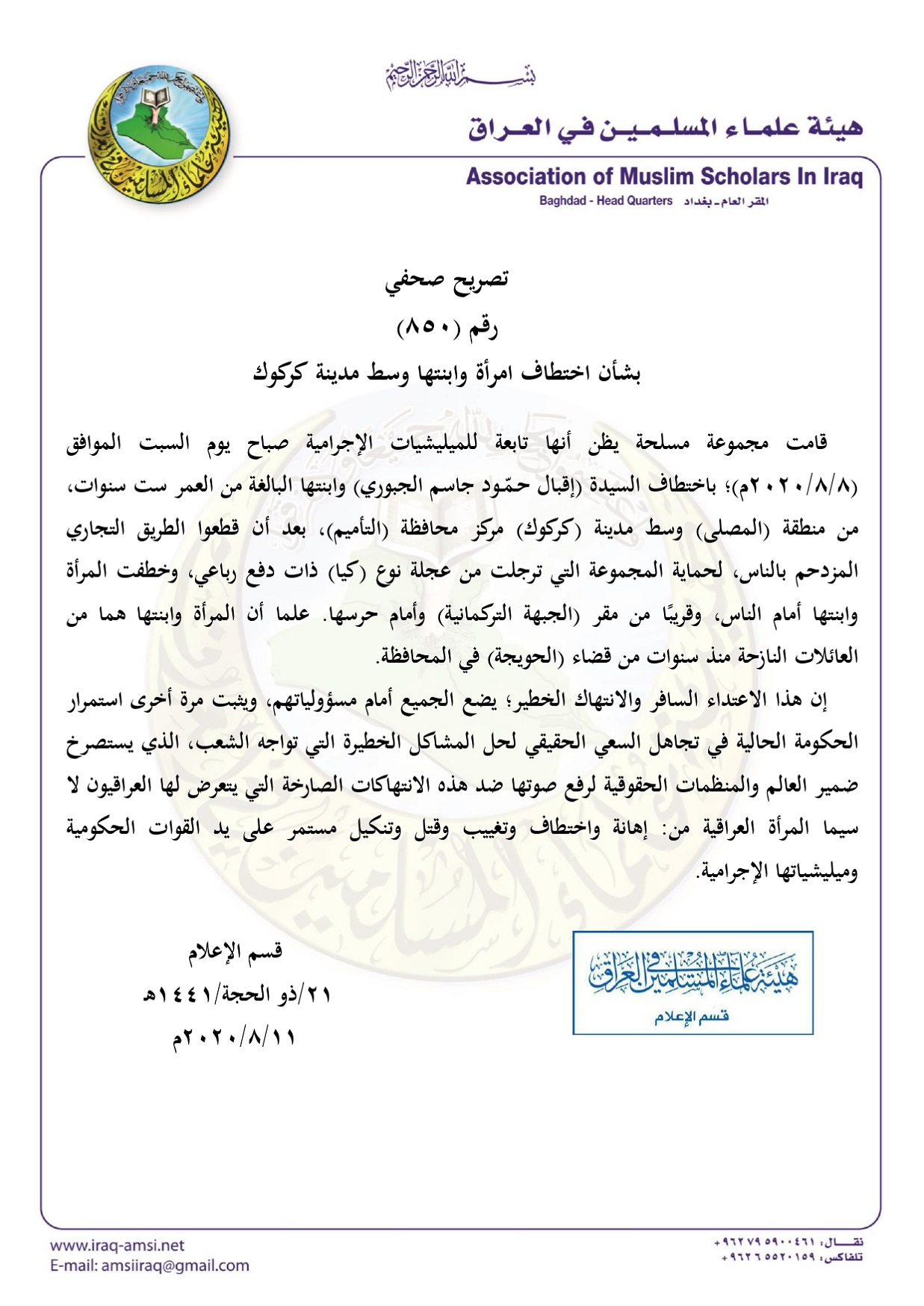 أصدر قسم الإعلام في هيئة علماء المسلمين، تصريحًا صحفيًا بخصوص اختطاف امرأة وابنتها وسط مدينة كركوك، وفيما يلي نص التصريح: