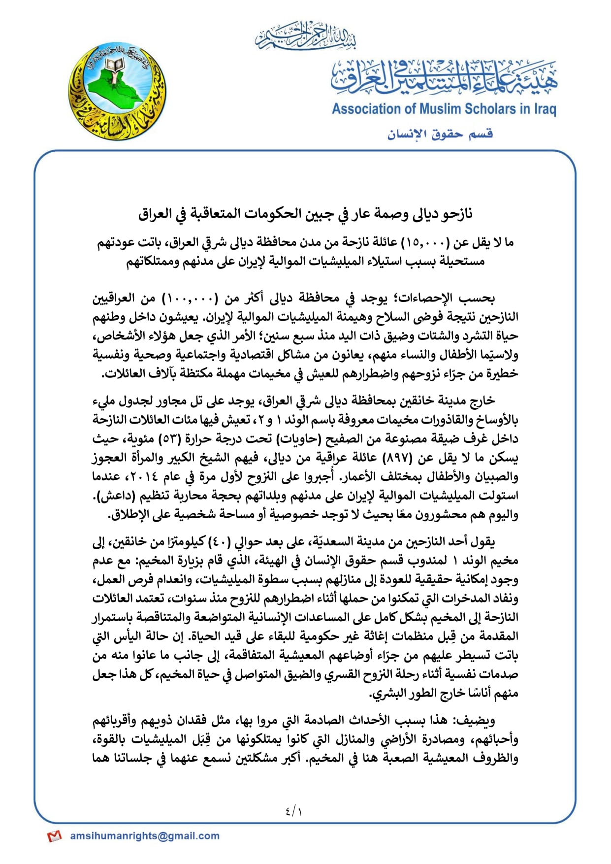 أصدر قسم حقوق الإنسان في هيئة علماء المسلمين في العراق تقريرًا بعنوان: نازحو ديالى وصمة عار في جبين الحكومات المتعاقبة في العراق، وفيما يلي نص التقرير: