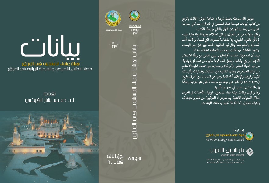 الهيئة نت| قسم الثقافة في هيئة علماء المسلمين يُعلن عن إتاحة إصداره: (بيانات هيئة علماء المسلمين في العراق؛ حصاد الاحتلال الأمريكي والهيمنة الإيرانية في العراق) بأجزائه الأربعة؛ بصيغة (PDF) في منصات الهيئة الإعلامية وحساباتها في وسائل التواصل الاجتماعي، وفق الروابط الآتية: