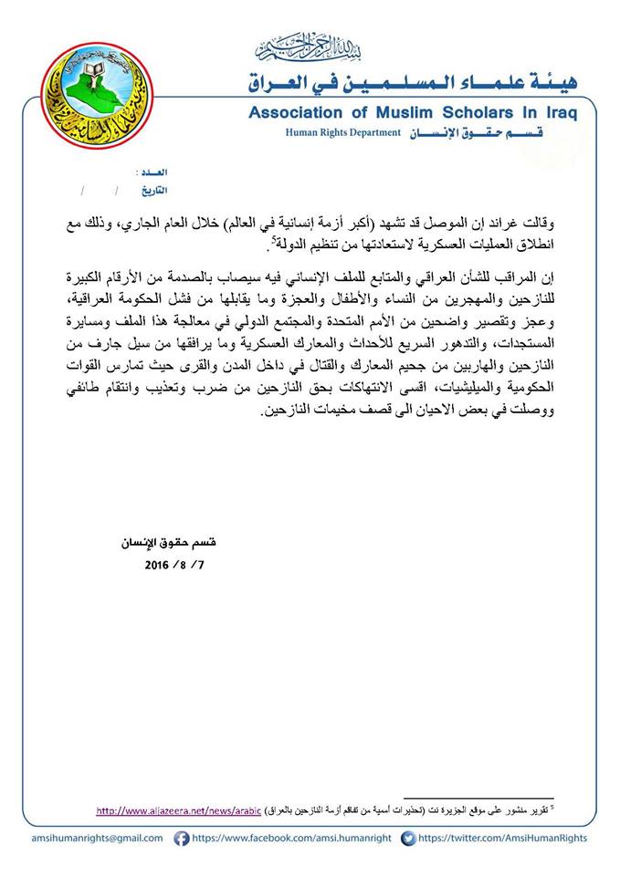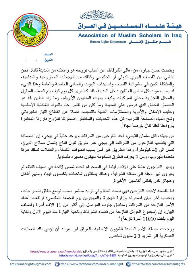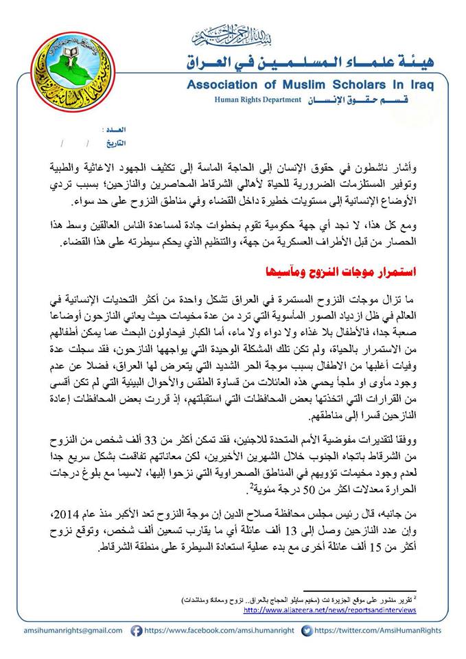 إن المراقب للشأن العراقي والمتابع للملف الإنساني فيه سيصاب بالصدمة من الأرقام الكبيرة للنازحين والمهجرين من النساء والأطفال والعجزة وما يقابلها من فشل الحكومة العراقية، وعجز وتقصير واضحين من الأمم المتحدة والمجتمع الدولي في معالجة هذا الملف ومسايرة المستجدات، والتدهور السريع للأحداث والمعارك العسكرية وما يرافقها من سيل جارف من النازحين والهاربين من جحيم المعارك والقتال في داخل المدن والقرى حيث تمارس القوات الحكومية والميليشيات، اقسى الانتهاكات بحق النازحين من ضرب وتعذيب وانتقام طائفي ووصلت في بعض الاحيان الى قصف مخيمات النازحين.
