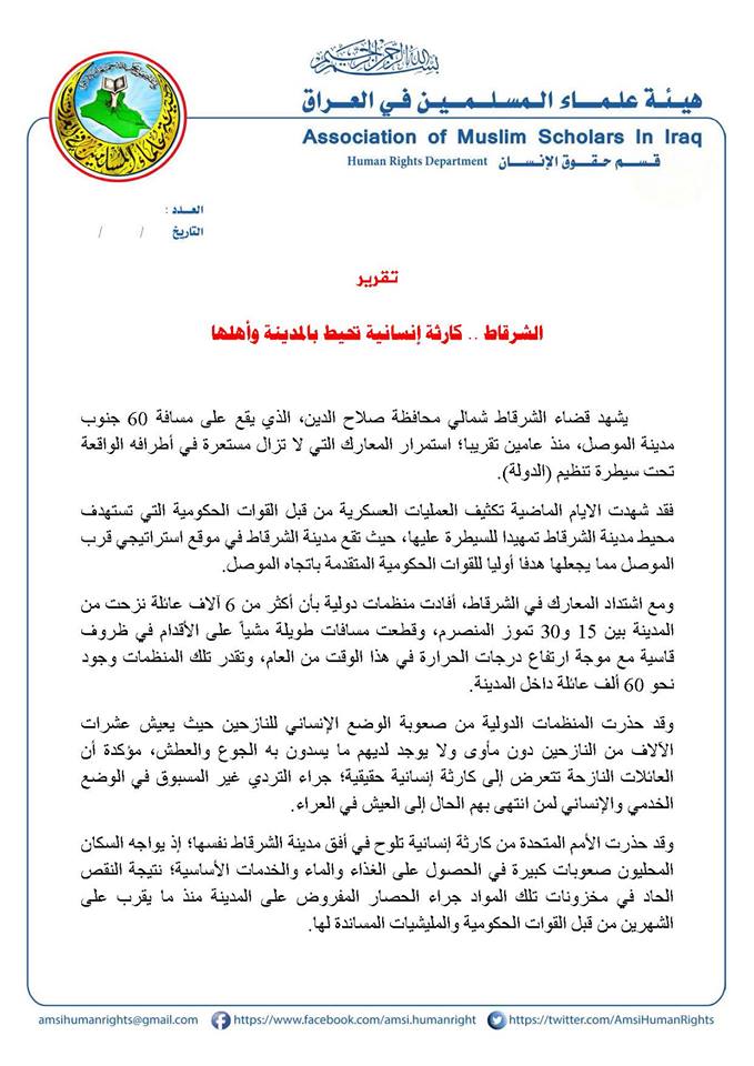 وأشار ناشطون في حقوق الإنسان إلى الحاجة الماسة إلى تكثيف الجهود الاغاثية والطبية وتوفير المستلزمات الضرورية للحياة لأهالي الشرقاط المحاصرين والنازحين؛ بسبب تردي الأوضاع الإنسانية إلى مستويات خطيرة داخل القضاء وفي مناطق النزوح على حد سواء.
