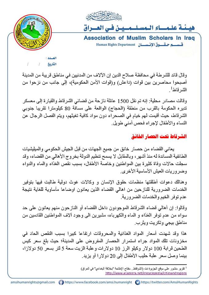 وقالت مصادر محلية: إنه تم نقل 1500 عائلة نازحة من قضائي الشرقاط والقيارة إلى معسكر تديره الحكومة بالقرب من منطقة (الحجاج) الواقعة على مسافة 80 كيلومترا تقريبا جنوبي الشرقاط، حيث أقيمت لهم خيام في الصحراء دون مواد كافية تغيثهم، ويتم الفصل الرجال عن النساء والأطفال لإجراء فحص أمني طويل.