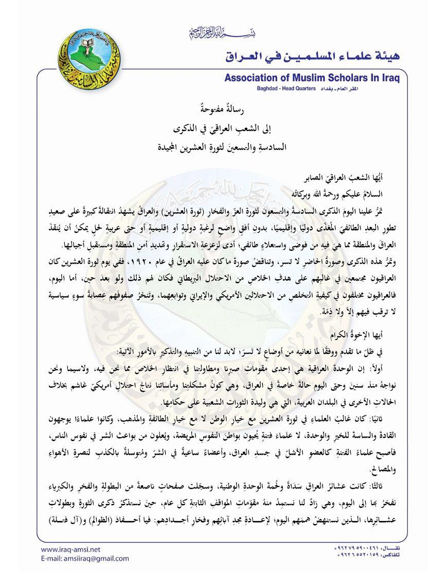 رسالةٌ مفتوحةٌ إلى الشعبِ العراقيّ في الذكرى السادسةِ والتسعينَ لثورةِ العشرين المجيدة