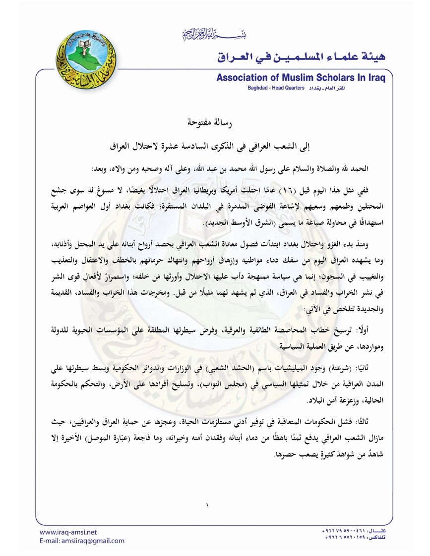 • رسالة مفتوحة إلى الشعب العراقي في الذكرى السادسة عشرة لاحتلال العراق