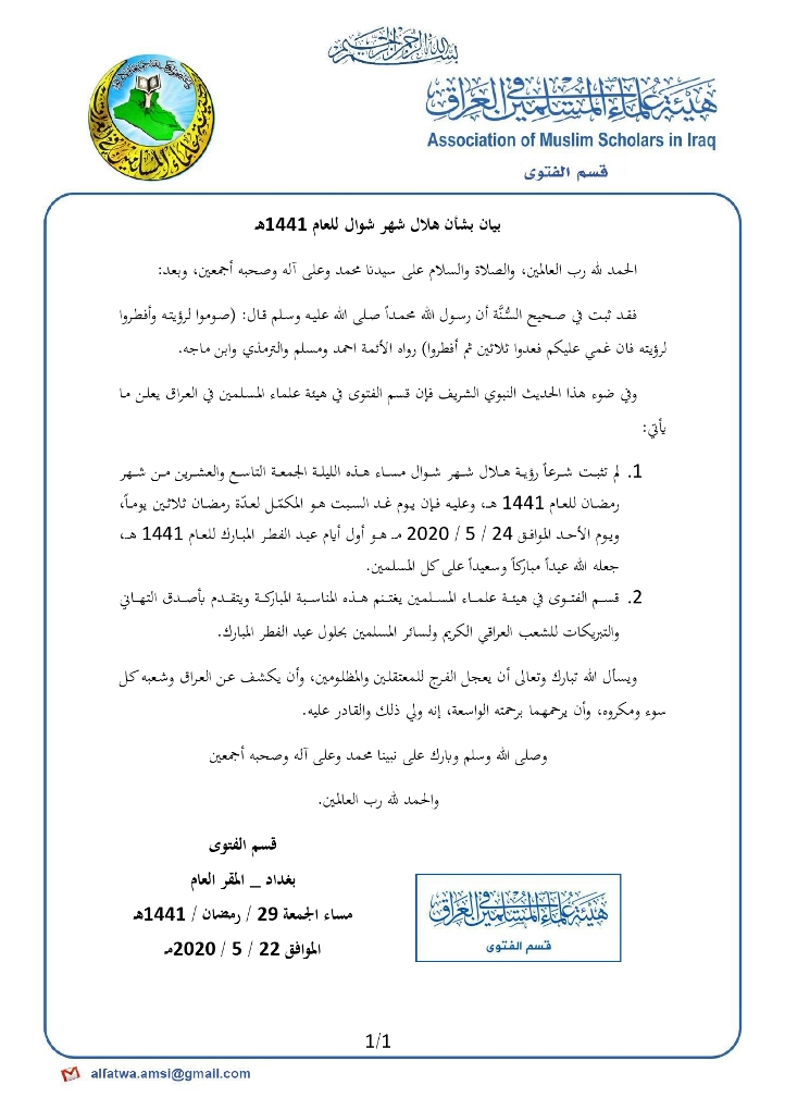 أصدر قسم الفتوى في هيئة علماء المسلمين في العراق؛ بيانًا بشأن هلال شهر شوال للعام.