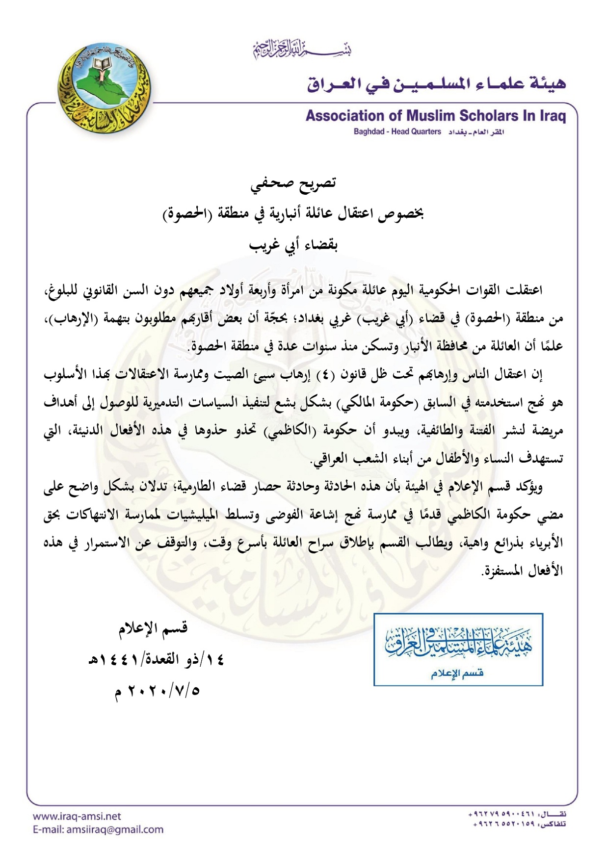 • تصريح صحفي بخصوص اعتقال عائلة أنبارية في منطقة (الحصوة) بقضاء أبي غريب