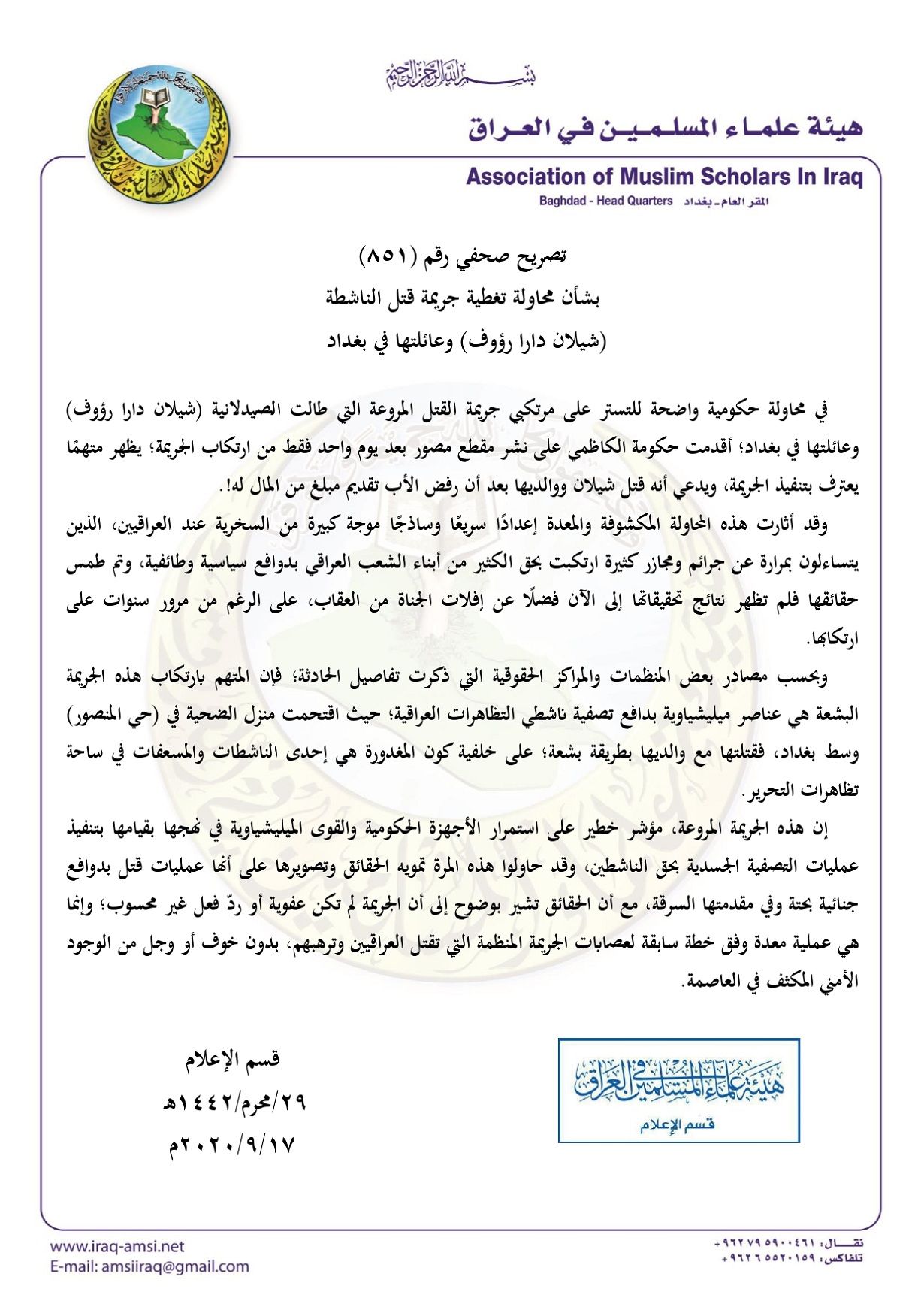• تصريح صحفي رقم (851) بشأن محاولة تغطية جريمة قتل الناشطة (شيلان دارا رؤوف) وعائلتها في بغداد