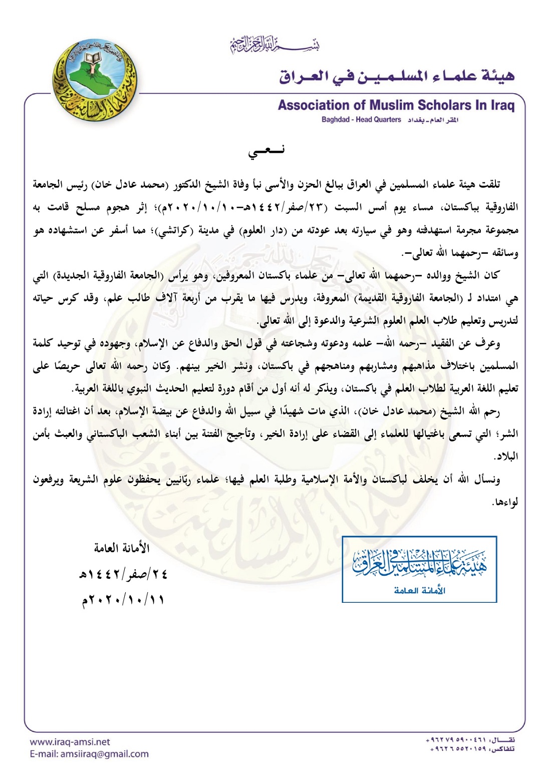 • هيئة علماء المسلمين تنعى الشيخ الدكتور (محمد عادل خان) رئيس الجامعة الفاروقية بباكستان
